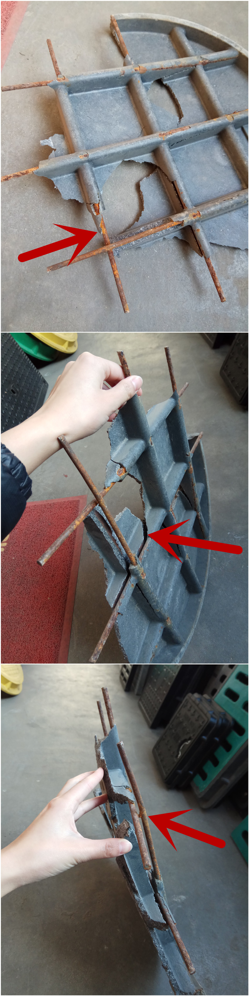 這是我們從市場上買的低價井蓋,還沒等安裝上,隨便踩踩就這樣了。