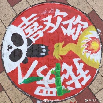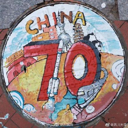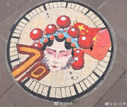 四川大學的同學們花式表白祖國,用中國京劇、中國航天、中國高鐵、萬里長城、大熊貓、卡通敖丙等元素與新中國成立70周年的創(chuàng)意結(jié)合,以井蓋為畫布,用水粉作畫,以色彩和圖案將井蓋變成一道亮麗的風景線,這表白杠杠的!