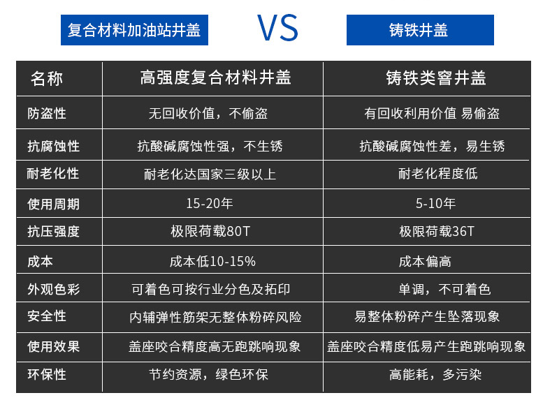 符合加油站標準的玻璃鋼高分子復(fù)合井蓋,具有強度高、韌性好、耐腐蝕、無靜電、不產(chǎn)生火花等優(yōu)點。